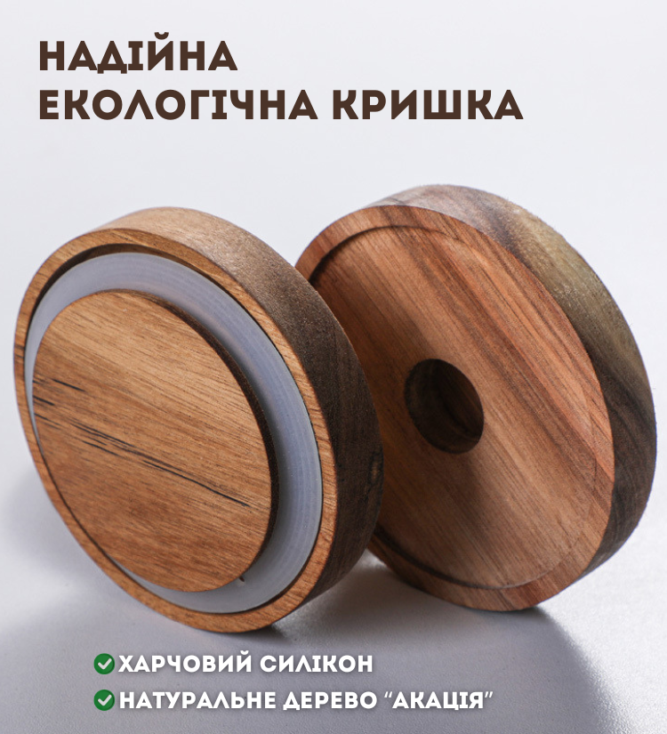 Оснащені герметичною кришкою із натурального дерева, яка дозволяє зберегти вміст від вологи та повітря.